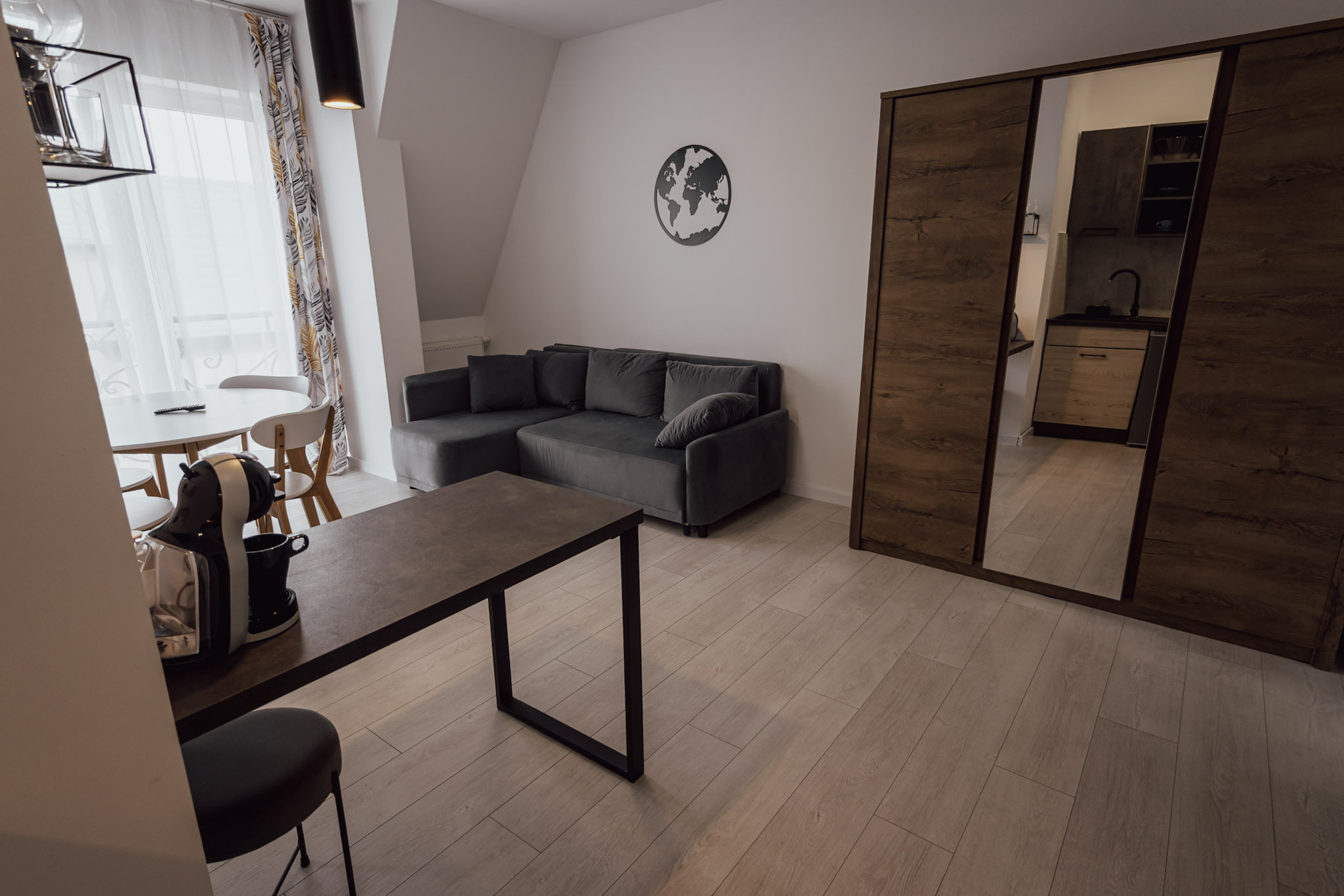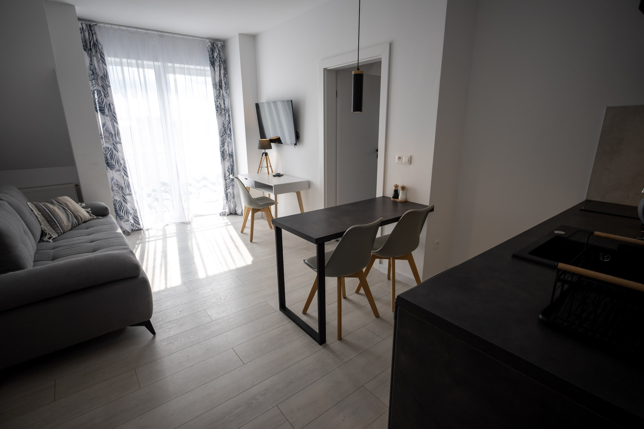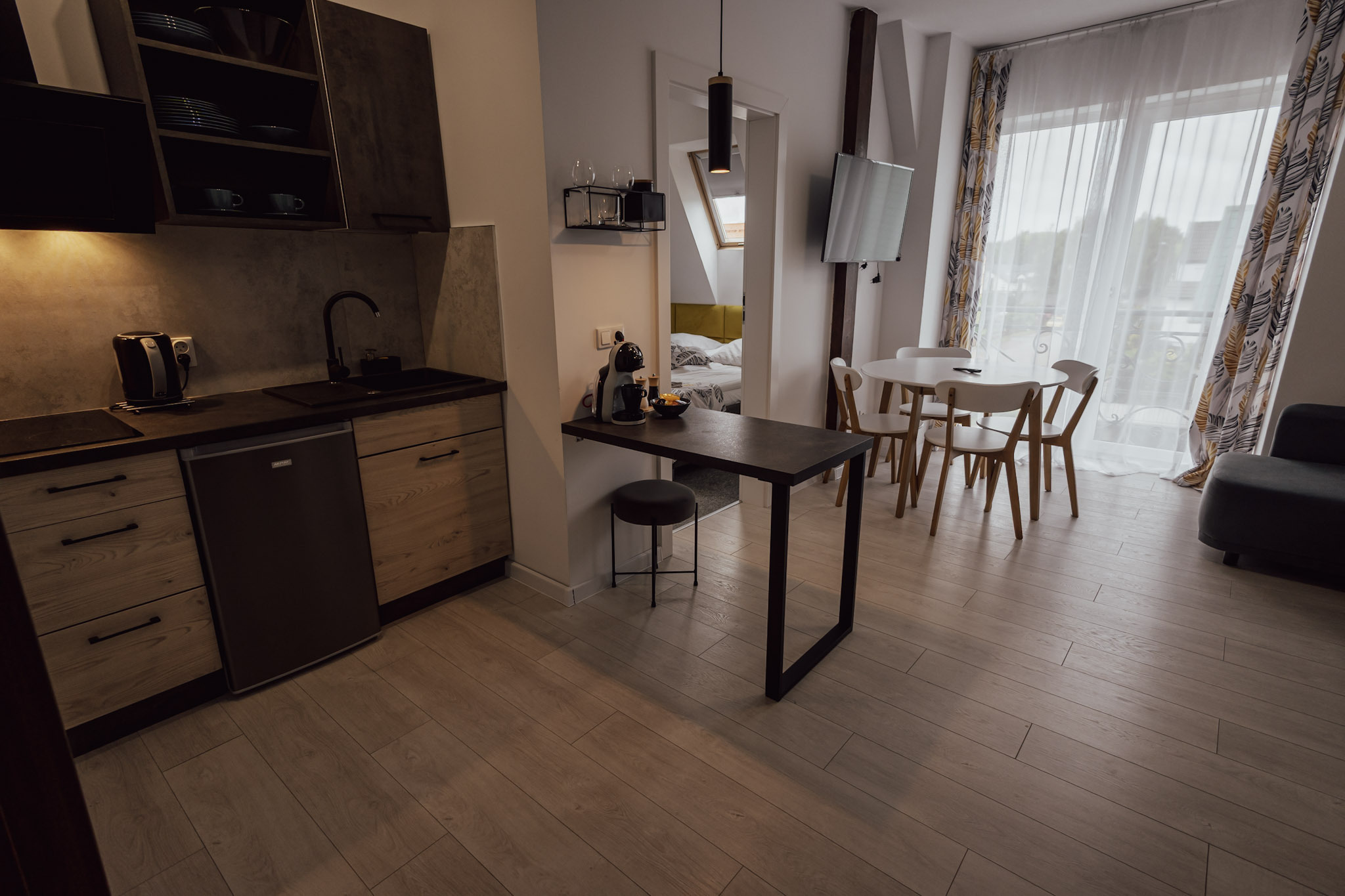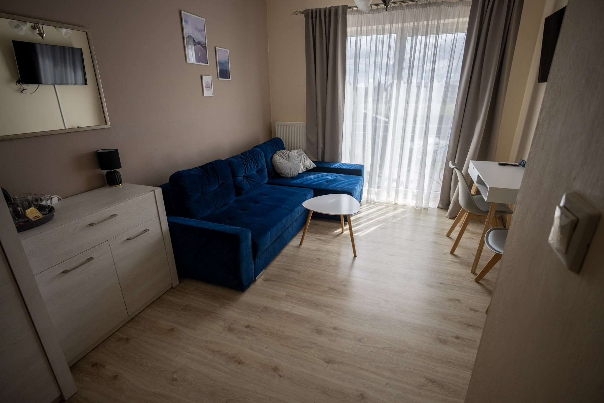 Apartament z jedną sypialnią oraz salonem z aneksem kuchennym. Apartament posiada rozkładaną kanapę dwuosobową w salonie i może pomieścić 4 osoby.