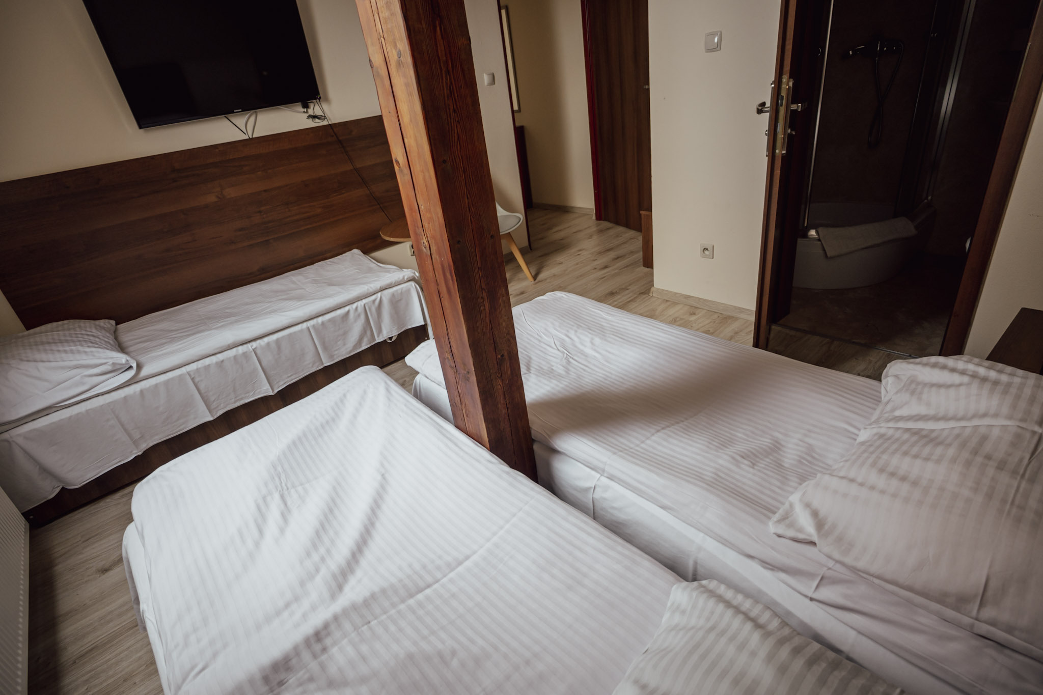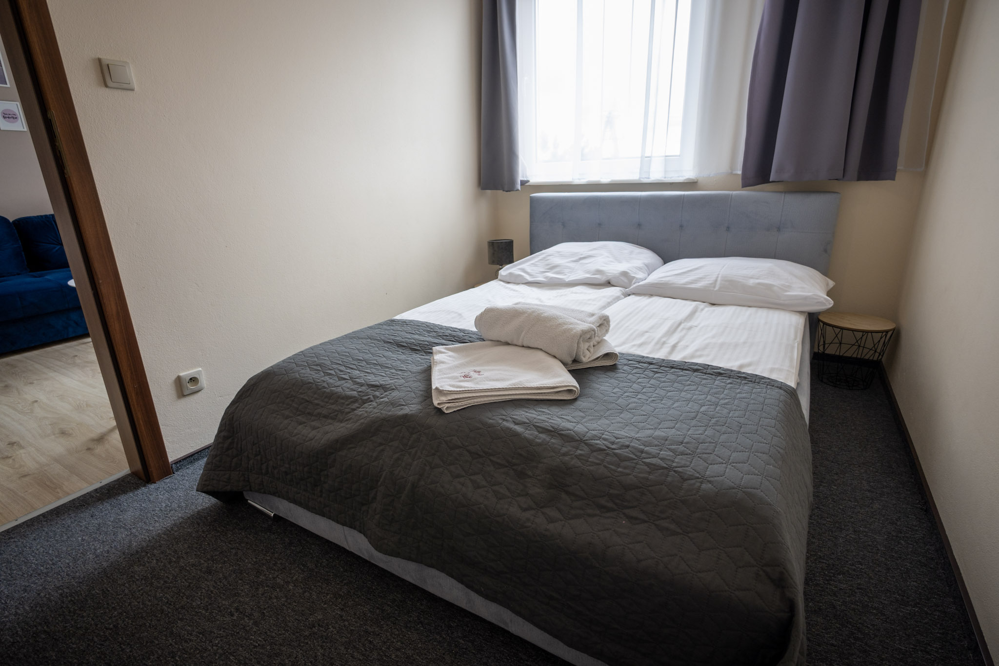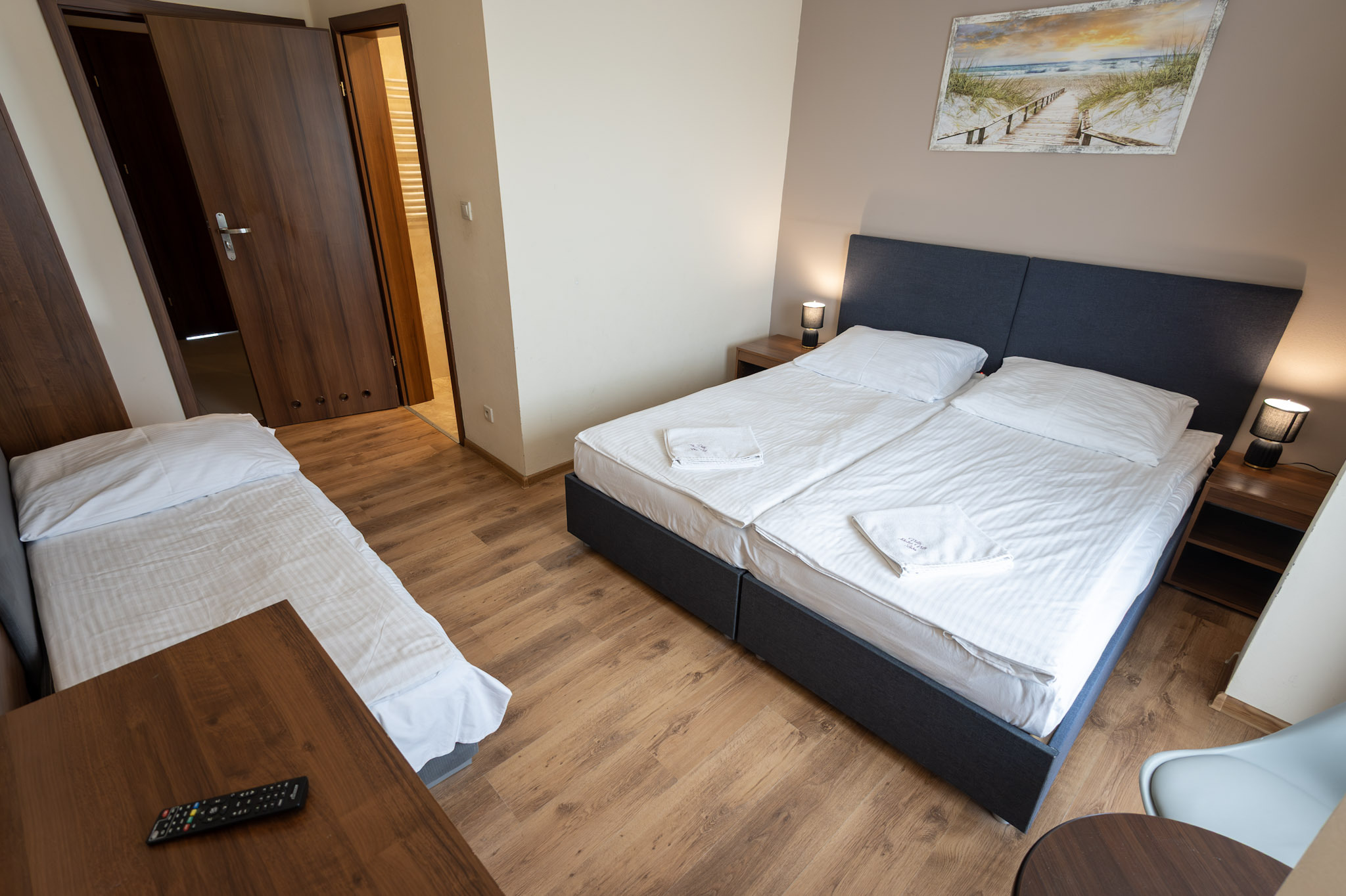 Przestronny pokój dla 5-osobowej rodziny. Posiada sypialnię z łóżkiem małżeńskim oraz przestrzeń z 3 łóżkami pojedynczymi. Tak jak pozostałe pokoje, jest wyposażony w minilodówkę, tv oraz czajnik elektryczny.