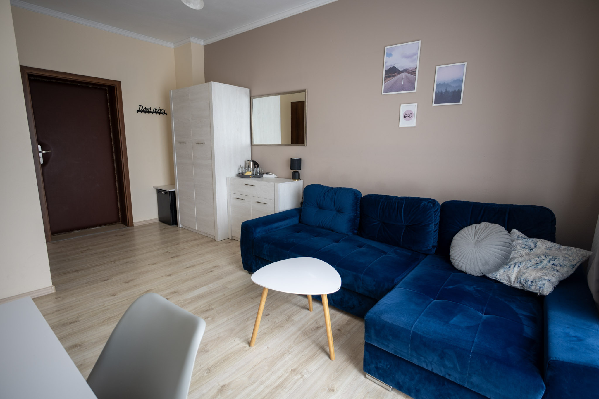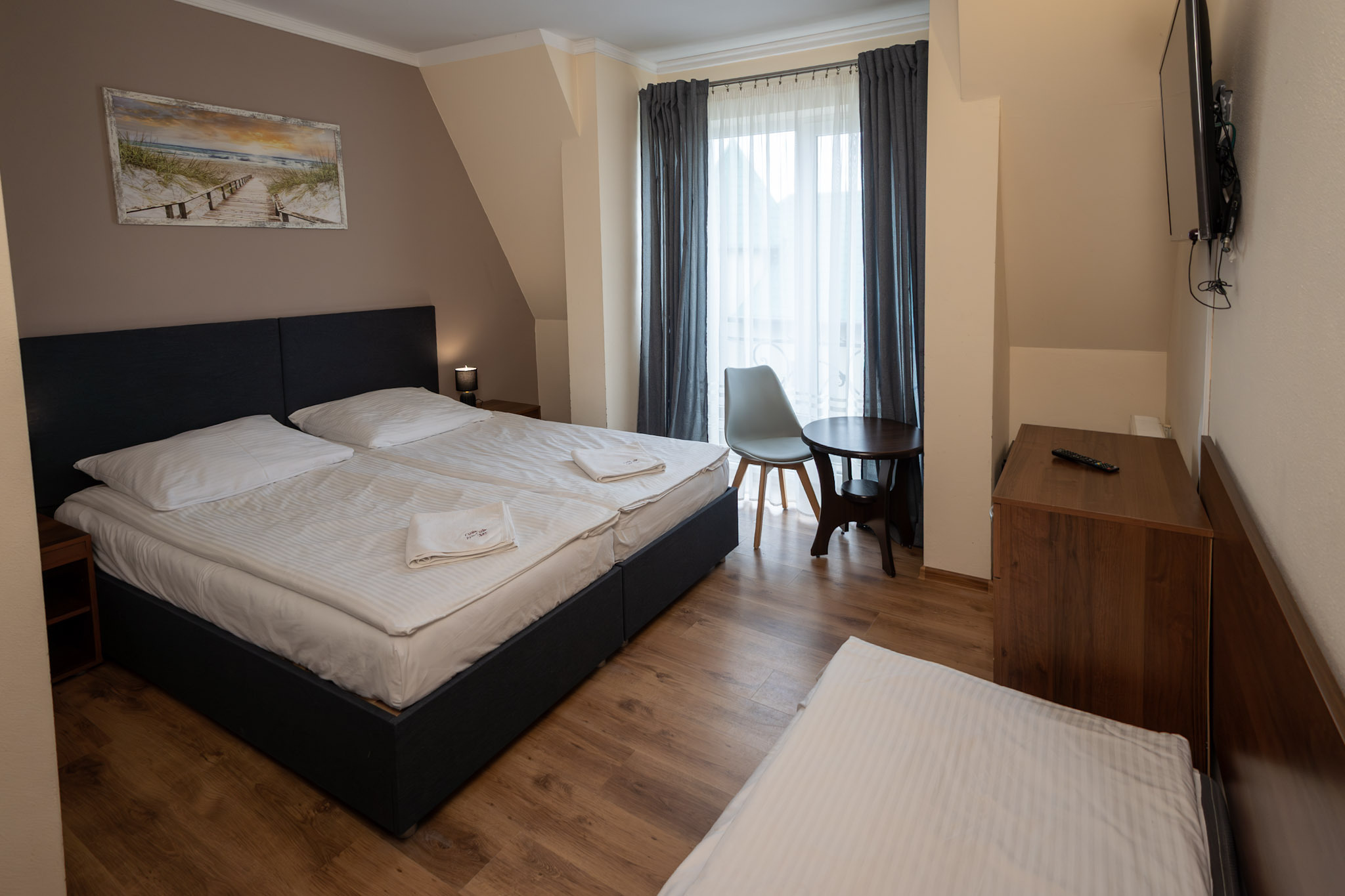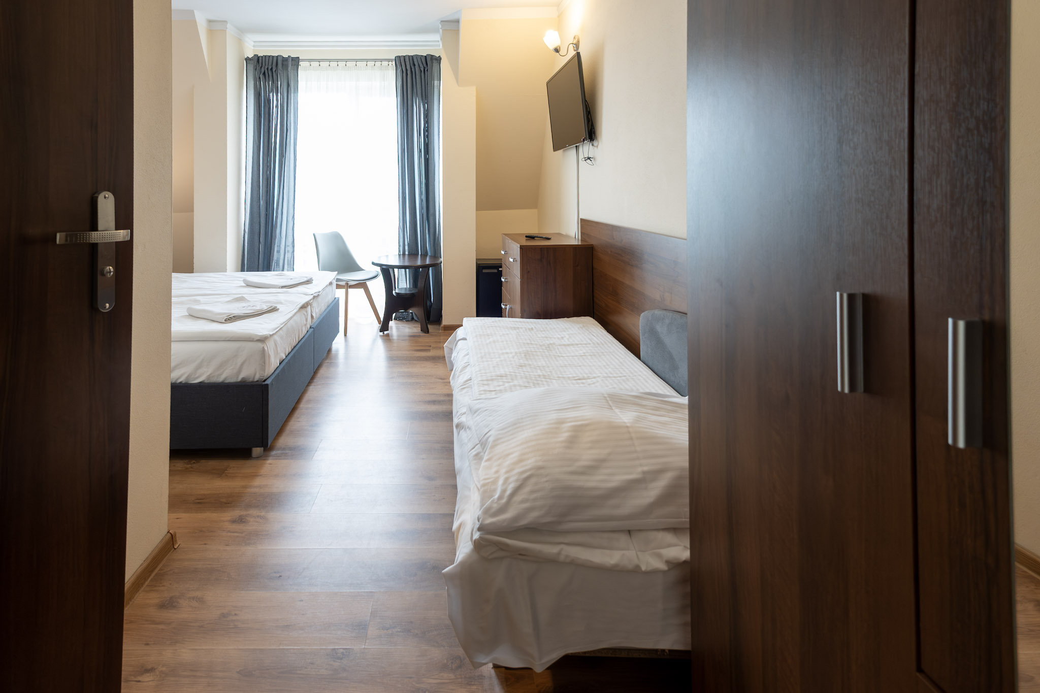 Przestronny pokój dla 5-osobowej rodziny. Posiada sypialnię z łóżkiem małżeńskim oraz przestrzeń z 3 łóżkami pojedynczymi. Tak jak pozostałe pokoje, jest wyposażony w minilodówkę, tv oraz czajnik elektryczny.
