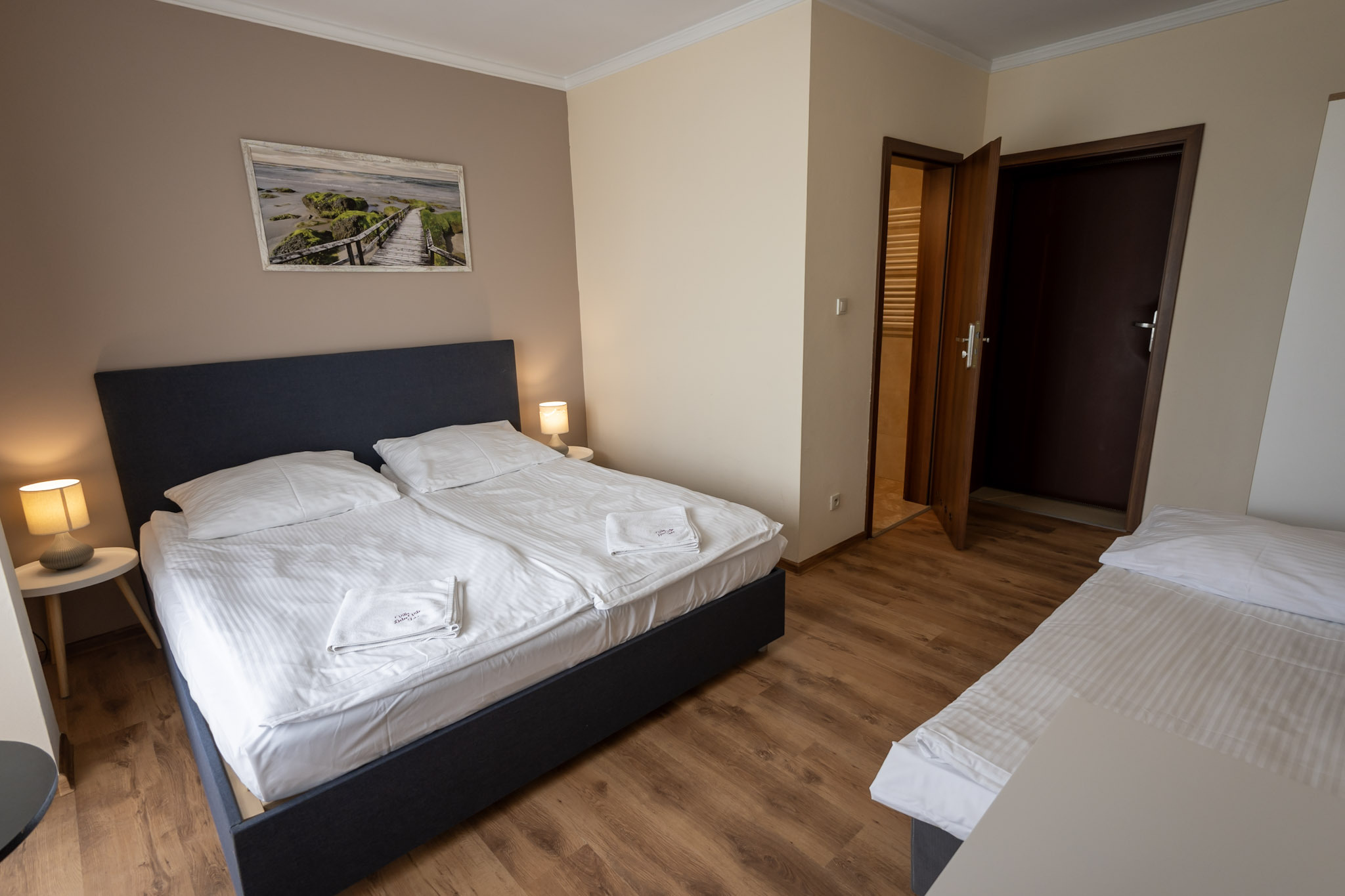 Pokój składa się z dwóch sypialni dwuosobowych łączonych drzwiami - obie sypialnie posiadają własne łazienki.